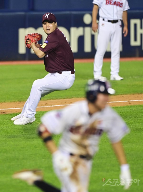 8회말 2사 2, 3루 두산 정수빈의 내야 땅볼 때 키움 김태훈이 타구를 잡아 1루로 송구하고 있다.