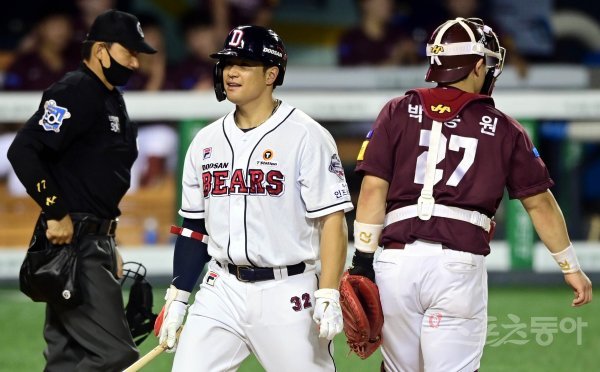 7회말 1사 1, 2루 두산 김재환이 삼진 아웃을 당하고 있다.