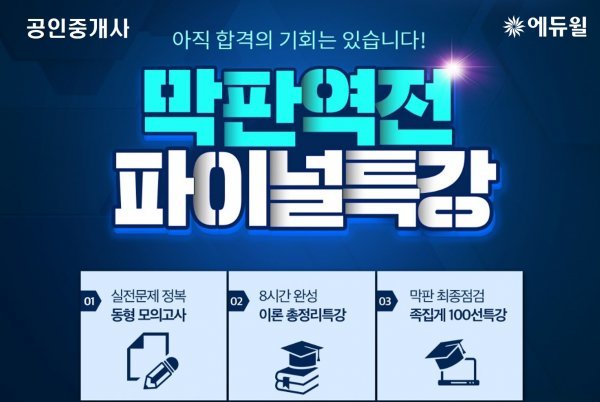 이에 종합교육기업 에듀윌 공인중개사학원은 혼자서 최종 점검을 하기 어려워하는 수험생들을 위해 ‘막판역전 파이널 특강’을 마련했다.