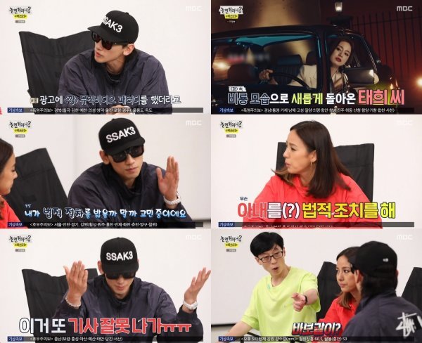 이에 비는 “‘깡’ 패러디를 했더라. 내가 법적 조치를 할까 고민 중이다”라고 농담을 던졌다. 이에 비와 이효리는 “무슨 아내를 법적조치 하느냐”고 비를 압박했다.