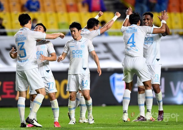 2일 서울 월드컵경기장에서 열린 ‘하나원큐 K리그1 2020’ 수원 삼성과 대구 FC의 경기에서 대구가 수원에 1-0으로 승리한 뒤 선수들이 그라운드에서 기쁨을 나누고 있다.