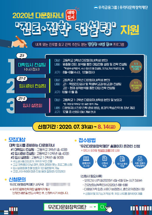우리금융의 우리다문화장학재단이 14일까지 다문화자녀의 대학 진학을 돕기 위한 진로·진학지원 프로그램 참여자를 모집(사진)한다.