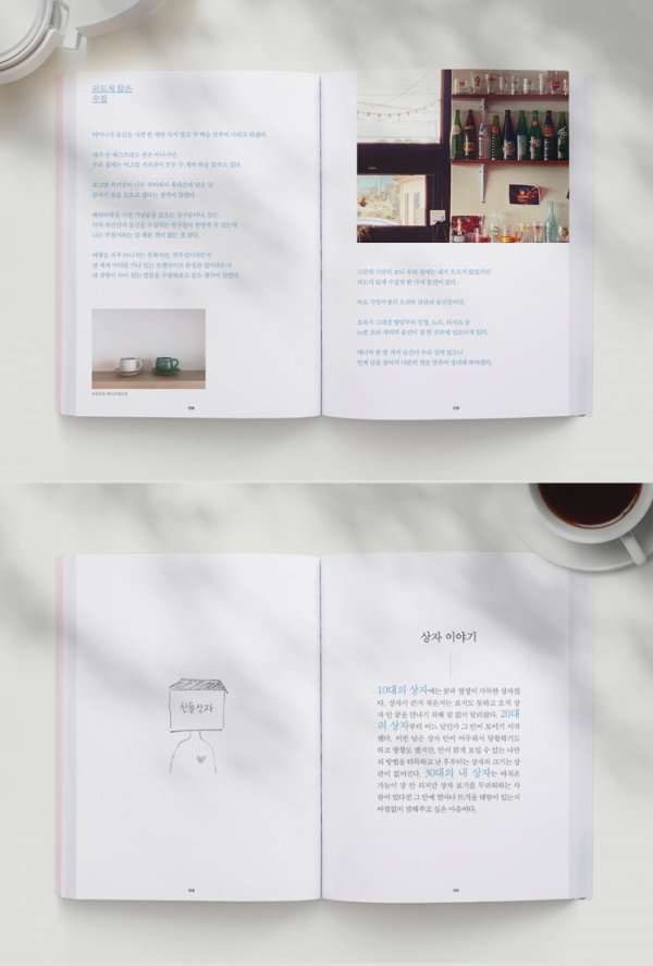 \'조그만 커피잔이 너무 귀여워서 휴대폰에 담은 날 갑자기 컵을 모으고 싶다는 생각이 들었다\', \'여행을 자주 다니지는 못하지만, 맥주컵이라든지 전 세계 어디를 가나 있는 프랜차이즈 한정판 컵이라든지 내 취향이 녹아 있는 컵들을 수집해 보고 싶은 생각이 들었다\' 등의 글귀에는 일상에서 마주하는 자신의 소소한 생각들을 산들다운 담백한 언어로 기록하고 있다.