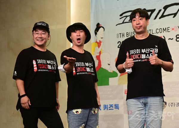 2시간 탈출 졸탄쇼 팀의 이재형, 한현민, 정진욱이 3일 서울 마포구 상암동 스탠포드 서울에서 열린 제8회 ‘부산국제코미디페스티벌’ 기자회견에서 포즈를 취하고 있다.