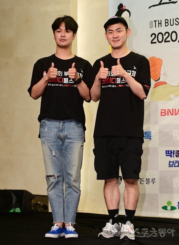 코미디헤이븐쇼 팀의 김동하, 김민수가 3일 서울 마포구 상암동 스탠포드 서울에서 열린 제8회 ‘부산국제코미디페스티벌’ 기자회견에서 포즈를 취하고 있다.