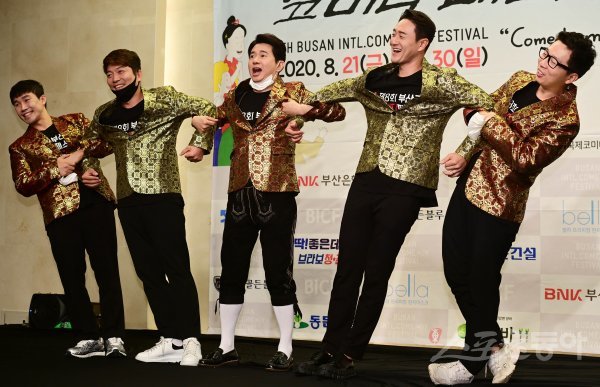 쇼그맨 팀의 박성호, 정범균, 김재욱, 김원효가 3일 서울 마포구 상암동 스탠포드 서울에서 열린 제8회 ‘부산국제코미디페스티벌’ 기자회견에서 포즈를 취하고 있다.