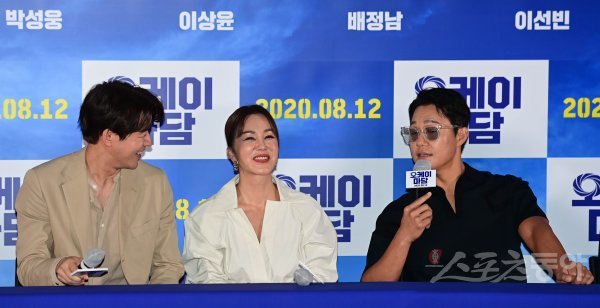배우 이상윤, 엄정화, 박성웅이 3일 서울 강남구 삼성동 메가박스 코엑스점에서 열린 영화 ‘오케이 마담’ 언론시사회에서 취재진의 질문에 답하고 있다.