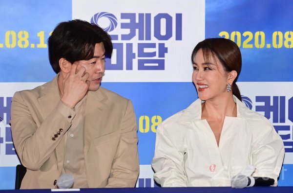 배우 이상윤과 엄정화가 3일 서울 강남구 삼성동 메가박스 코엑스점에서 열린 영화 ‘오케이 마담’ 언론시사회에서 이야기를 나누고 있다.