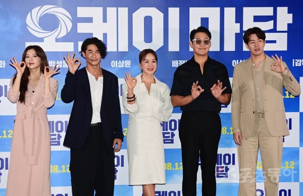 배우 이선빈, 배정남, 엄정화, 박성웅, 이상윤이 3일 서울 강남구 삼성동 메가박스 코엑스점에서 열린 영화 ‘오케이 마담’ 언론시사회에서 포즈를 취하고 있다.