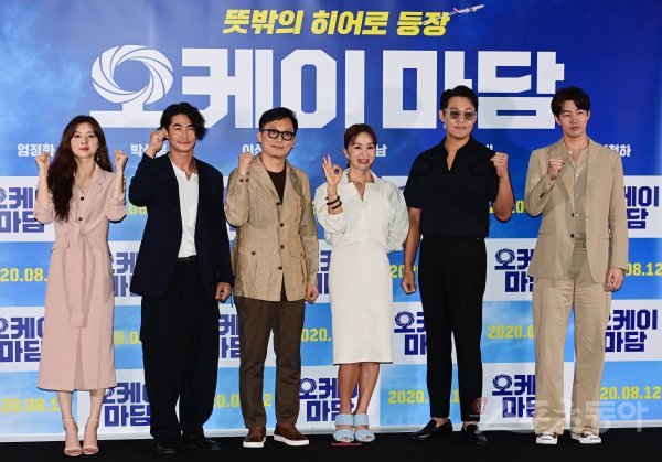 배우 이선빈, 배정남, 이철하 감독, 엄정화, 박성웅, 이상윤이 3일 서울 강남구 삼성동 메가박스 코엑스점에서 열린 영화 ‘오케이 마담’ 언론시사회에서 포즈를 취하고 있다.