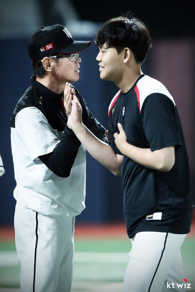\'나를 넘어라!\' KT 이강철 감독(왼쪽)은 최근 구단 유튜브 채널에 출연해 자신의 기록을 넘을 선수로 올해 입단한 고졸 루키 소형준을 꼽았다. 기대치가 드러나는 대목이다. 사진제공|KT 위즈
