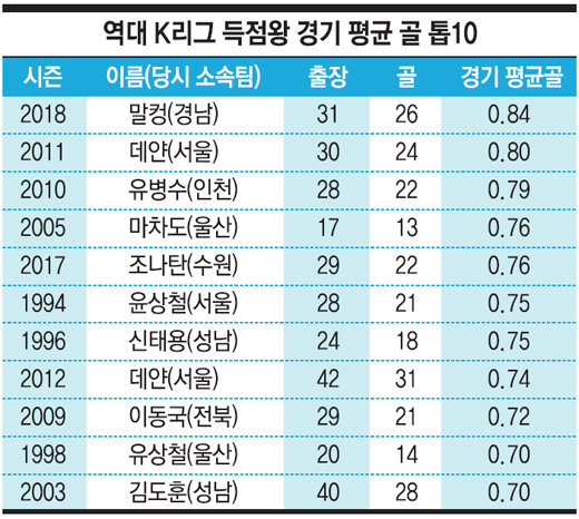관심을 끄는 건 20골 이상의 득점왕 등극뿐 아니라 경기당 1골 이상을 넣을 수 있느냐다. 올해 1부는 신종 코로나바이러스 감염증(코로나19) 여파로 축소된 27경기 체제다. 이제 13경기 남았는데, 9골만 추가하면 마의 기록인 ‘경기당 1골’도 가능해진다.