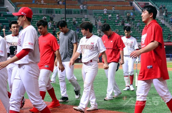 롯데에 0-8로 패하며 6연패에 빠진 SK 선수들이 그라운드를 빠져나가고 있다.