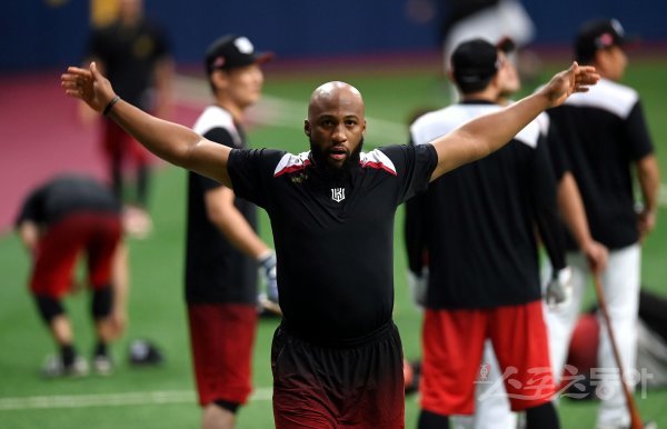 경기 전 kt 로하스가 스트레칭 훈련을 하고 있다.