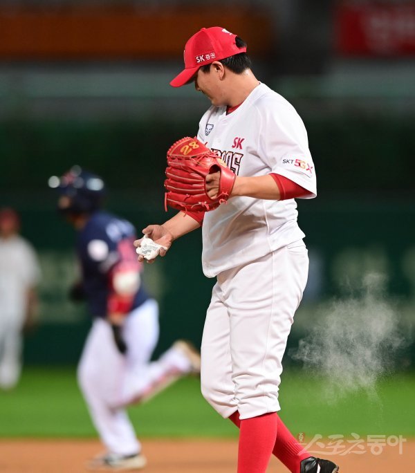 SK 조영우가 5회초 무사 상황에서 롯데에게 솔로 홈런을 허용한 뒤 아쉬워하고 있다.