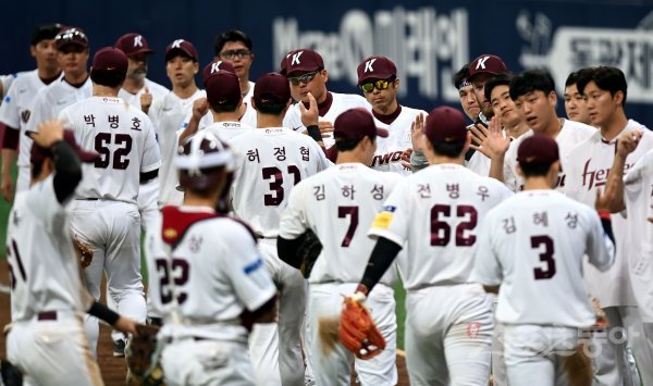키움이 kt에 3-2로 승리한 뒤 선수들이 손혁 감독, 코치들의 환영을 받고 있다.