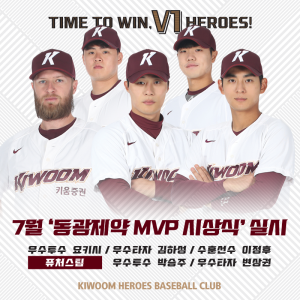 프로야구 키움 히어로즈(대표이사 하송)가 7일(금) 오후 6시 30분 서울 고척스카이돔에서 열리는 LG트윈스와 경기에 앞서 구단 ‘7월 MVP 시상식’을 진행한다.