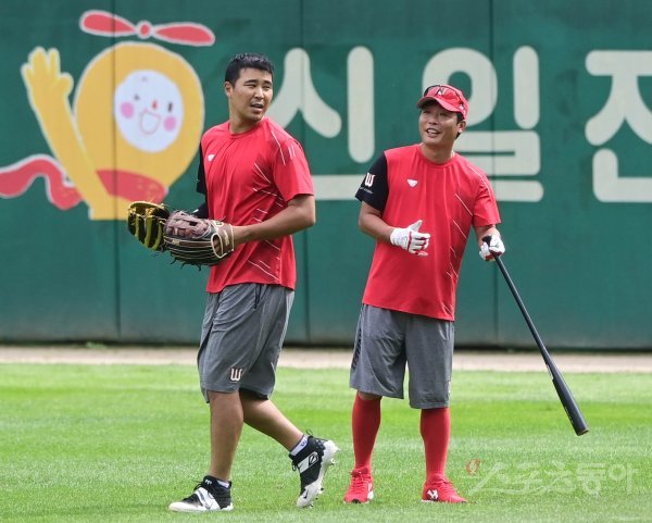 7일 인천 SK행복드림구장에서 ‘2020 신한은행 SOL KBO리그’ SK 와이번스와 삼성 라이온즈의 경기가 열린다. SK 조동화 코치가 훈련 중인 한동민을 보며 웃고 있다.