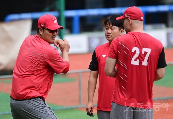 7일 인천 SK행복드림구장에서 ‘2020 신한은행 SOL KBO리그’ SK 와이번스와 삼성 라이온즈의 경기가 열렸다. SK 이진영 코치가 훈련 도중 로맥과 이야기를 하고 있다.