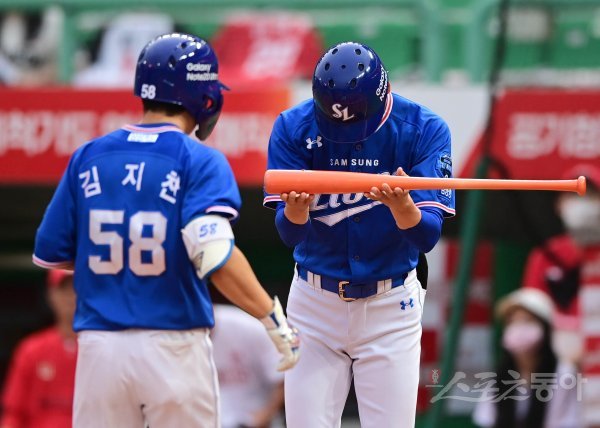 삼성 강명구 코치가 3회초 무사 솔로 홈런을 쳐낸 김지찬의 배트를 양손으로 들고 있다.