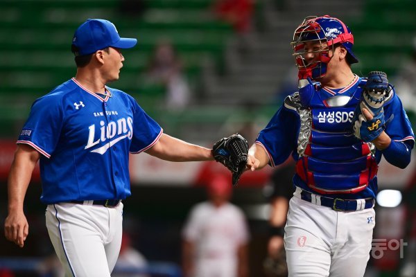 삼성 오승환과 강민호가 8회말 수비를 마친 뒤 주먹을 맞대고 있다.