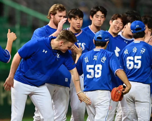 삼성이 SK에 2-0으로 승리를 거둔 뒤 뷰캐넌이 김지찬과 기쁨을 나누고 있다.
