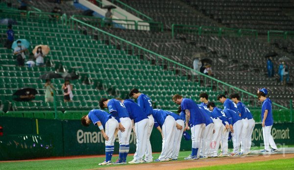 8일 인천 SK행복드림구장에서 ‘2020 신한은행 SOL KBO리그’ SK 와이번스와 삼성 라이온즈의 경기가 열렸다. 삼성이 SK에 강우콜드로 패배한 뒤 선수들이 관중들에게 인사하고 있다. 인천 | 주현희 기자 teth1147@donga.com