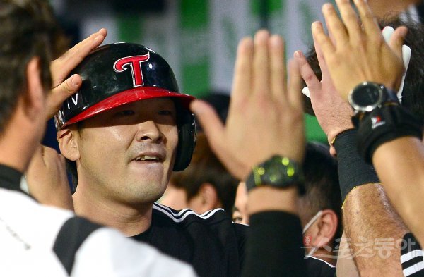 5회초 2사 LG 이형종이 우중월 솔로 홈런을 날리고 그라운드를 돌아 홈인해 하이파이브 하고 있다.