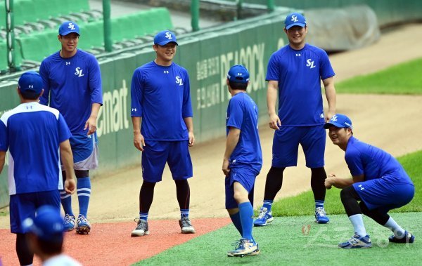 삼성 선수들이 훈련에 앞서 몸을 풀고 있다.