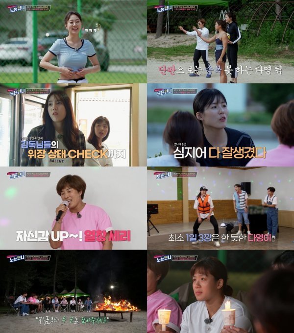 이후 레크리에이션 타임에는 언니들 모두 난생 처음 해보는 다양한 게임들을 섭렵하며 텐션이 치솟는 즐거운 시간을 보냈다. 또 장기자랑 순서에서는 각자 애창곡을 선보이며 노래 실력을 자랑하는가 하면, 비의 '깡' 커버댄스를 소화한 이다영이 '인싸'로 등극하며 열기를 더했다.