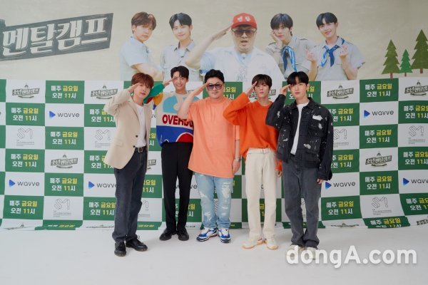 가수 정세운, 이진혁, 데프콘, 김우석, 김재환(순서대로)이 12일 온라인으로 진행된 웨이브 오리지널 웹 예능 ‘소년멘탈캠프’ 랜선 제작발표회에 참석해 포토타임을 갖고 있다.