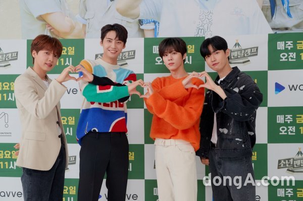 가수 정세운, 이진혁, 김우석, 김재환(순서대로)이 12일 온라인으로 진행된 웨이브 오리지널 웹 예능 ‘소년멘탈캠프’ 랜선 제작발표회에 참석해 포토타임을 갖고 있다.