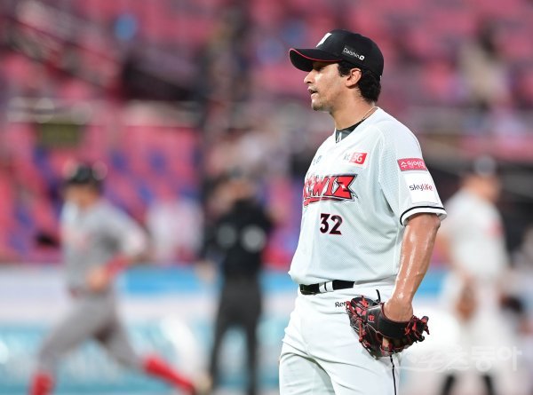 KT 쿠에바스가 3회초 1사 1, 3루 SK 최정에게 좌월 3점 홈런을 허용한 뒤 아쉬워하고 있다.