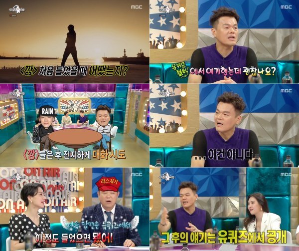 이에 김구라는 비의 ‘깡’을 들었을 때 어땠냐고 물었다. 박진영은 ‘라디오스타’보다 먼저 녹화한 tvN ‘유 퀴즈 온 더 블록’에서 언급했다고 털어놓으며 난감해했다. 박진영은 망설이다 “비에게 진지하게 얘기했다. 앉혀놓고 ‘이건 아니다’라고 했다”고 밝혔다. 김구라는 짧은 언급에도 만족하며 “그 후의 이야기는 ‘유 퀴즈 온 더 블록’에서 확인하시라”고 전했다.