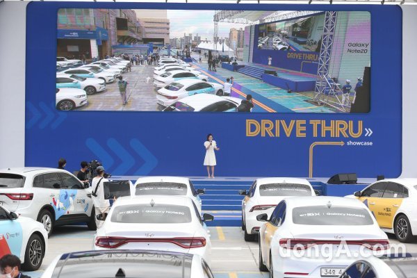 트로트 가수 송가인이 13일 오전 서울 성동구 비트플렉스에서 열린 갤럭시 노트20 5G 드라이브 스루 행사에 참석해 축하 무대를 선보이고 있다.