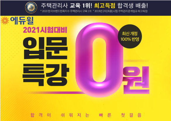 종합교육기업 에듀윌은 2021년 주택관리사 시험 준비를 이제 막 시작하는 수험생을 위해 최신 개정사항을 전격 반영한 ‘입문 특강 0원’ 이벤트를 마련했다.