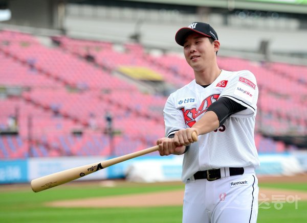 오늘 SK에서 KT로 트레이드 된 포수 이홍구가 경기 전 포토타임을 갖고 있다.