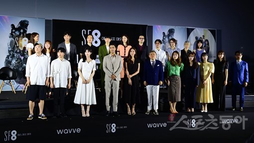 인공지능, 로봇 등을 소재로 한 8편의 단편영화를 묶은 SF시리즈 ‘SF8’이 14일 MBC를 통해 시청자를 만난다. 사진은 ‘SF8‘의 감독들과 출연진이 8일 서울 CGV용산아이파크몰점에서 연 제작보고회 모습. 주현희 기자 teth1147@donga.com