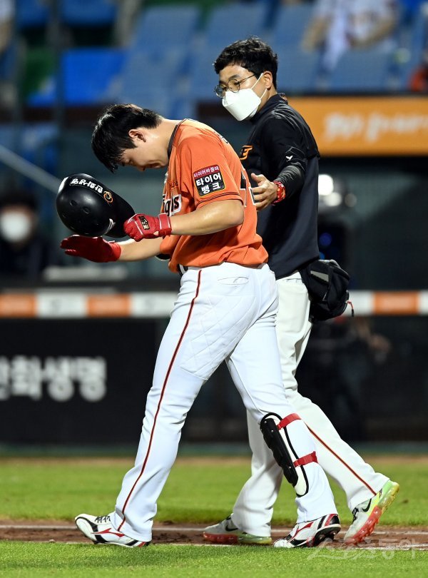 14일 대전 한화생명이글스파크에서 ‘2020 신한은행 SOL KBO리그’ 한화 이글스와 삼성 라이온즈의 경기가 열렸다. 7회말 1사 1루에서 한화 정은원이 삼성 뷰캐넌의 볼에 맞은 뒤 1루로 걸어가고 있다.