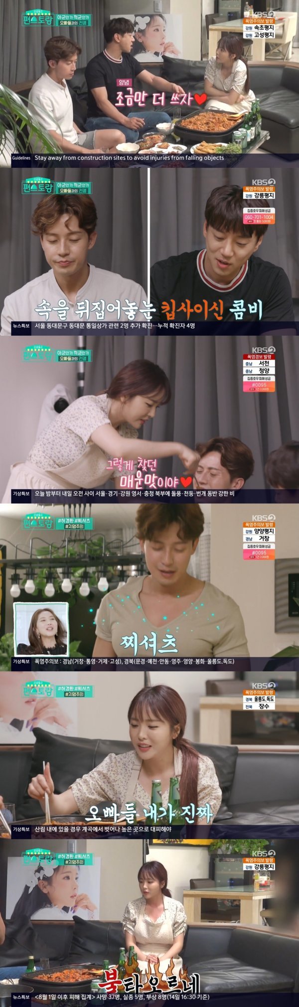 보기만 해도 군침이 꼴깍 넘어가는 안주 메뉴들이 속속 등장한 가운데 깜짝 편셰프 홍진영의 유쾌한 메뉴 시식회가 웃음을 선사했다. 이날 홍진영은 평소 절친한 사이인 허경환과 황치열을 집으로 초대했다. 이어 홍진영은 야심차게 준비한 메뉴 ‘곱닭오리탕’을 대용량으로 선보였다.