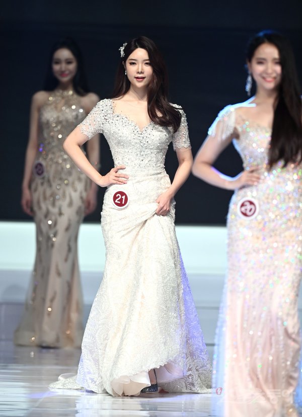 15일 서울 광진구 그랜드 워커힐 서울에서 ‘2020 미스그랜드코리아’ 최종 본선 대회가 개최됐다. 참가자 윤혜진이 드레스 퍼레이드를 하고 있다.미스 그랜드 코리아는‘평화와 비폭력’을 주제로 시작된 세계 최고 국제 미인 대회인 ‘미스 그랜드 인터내셔널(Miss Grand International)’에 출전할 한국 대표를 선발하는 대회다.
