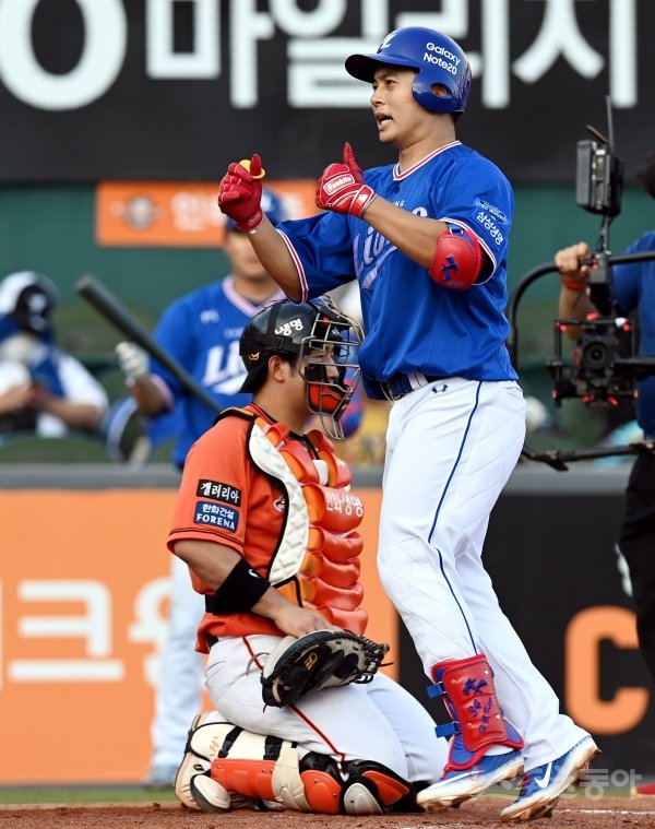16일 대전 한화생명이글스파크에서 ‘2020 신한은행 SOL KBO리그’ 한화 이글스와 삼성 라이온즈의 경기가 열렸다. 5회초 무사에서 삼성 김헌곤이 솔로 홈런을 쏘아 올린 뒤 환호하고 있다.