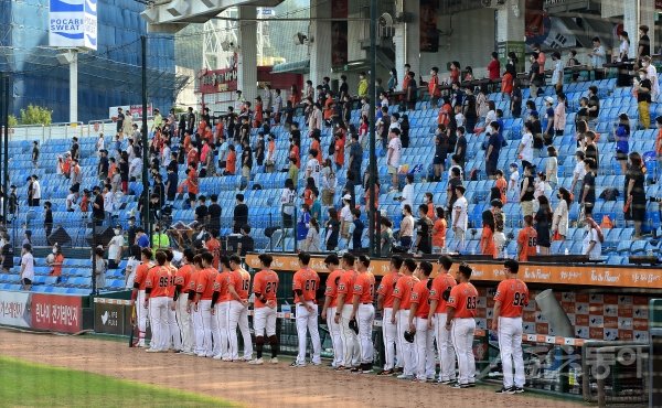 16일 대전 한화생명이글스파크에서 ‘2020 신한은행 SOL KBO리그’ 한화 이글스와 삼성 라이온즈의 경기가 열렸다. 수도권 야구장이 무관중으로 펼쳐지는 가운데 한화 선수 및 관중들이 국기에 대한 경례를 하고 있다.
