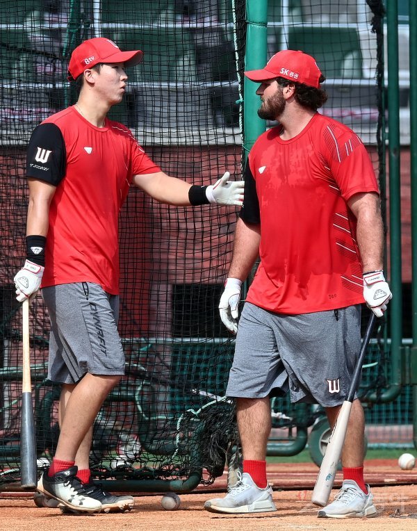 19일 인천 SK행복드림구장에서 ‘2020 신한은행 SOL KBO리그’ SK 와이번스와 한화 이글스의 경기가 열린다. 경기 전 SK 새 외국인 타자 화이트가 배팅 훈련을 마친 뒤 최항의 격려를 받고 있다.