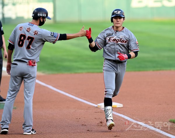 1회초 무사 1루에서 한화 강경학이 투런 홈런을 쏘아 올린 뒤 추승우 코치의 환영을 받고 있다.