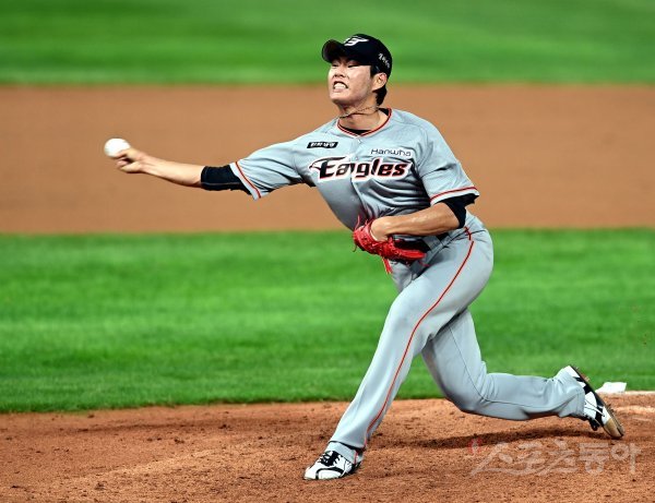 5회말 무사에서 한화 오동욱이 구원 등판해 볼을 던지고 있다.