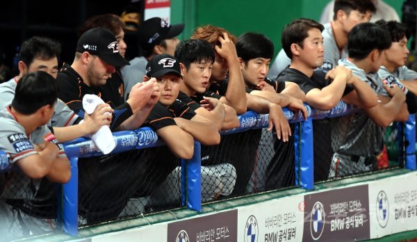 6-26으로 뒤진 9회초 한화의 공격 때 선수들이 더그아웃에서 경기를 지켜보고 있다.