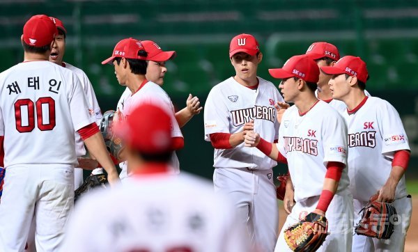 SK가 한화에 26-6으로 승리한 뒤 선수들이 그라운드에서 기쁨을 나누고 있다.