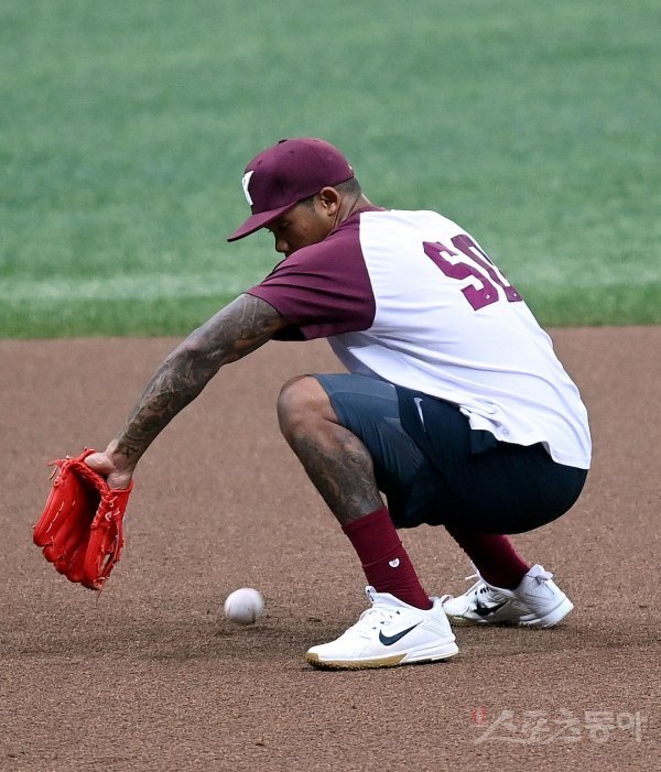 경기 전 키움 러셀이 유격수 훈련을 하다 볼을 빠뜨리고 있다.