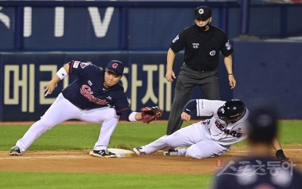 두산 1루주자 김재환이 3회말 2사 1루 상황에서 롯데의 폭투를 틈타 3루로 파고들어 세이프 되고 있다.